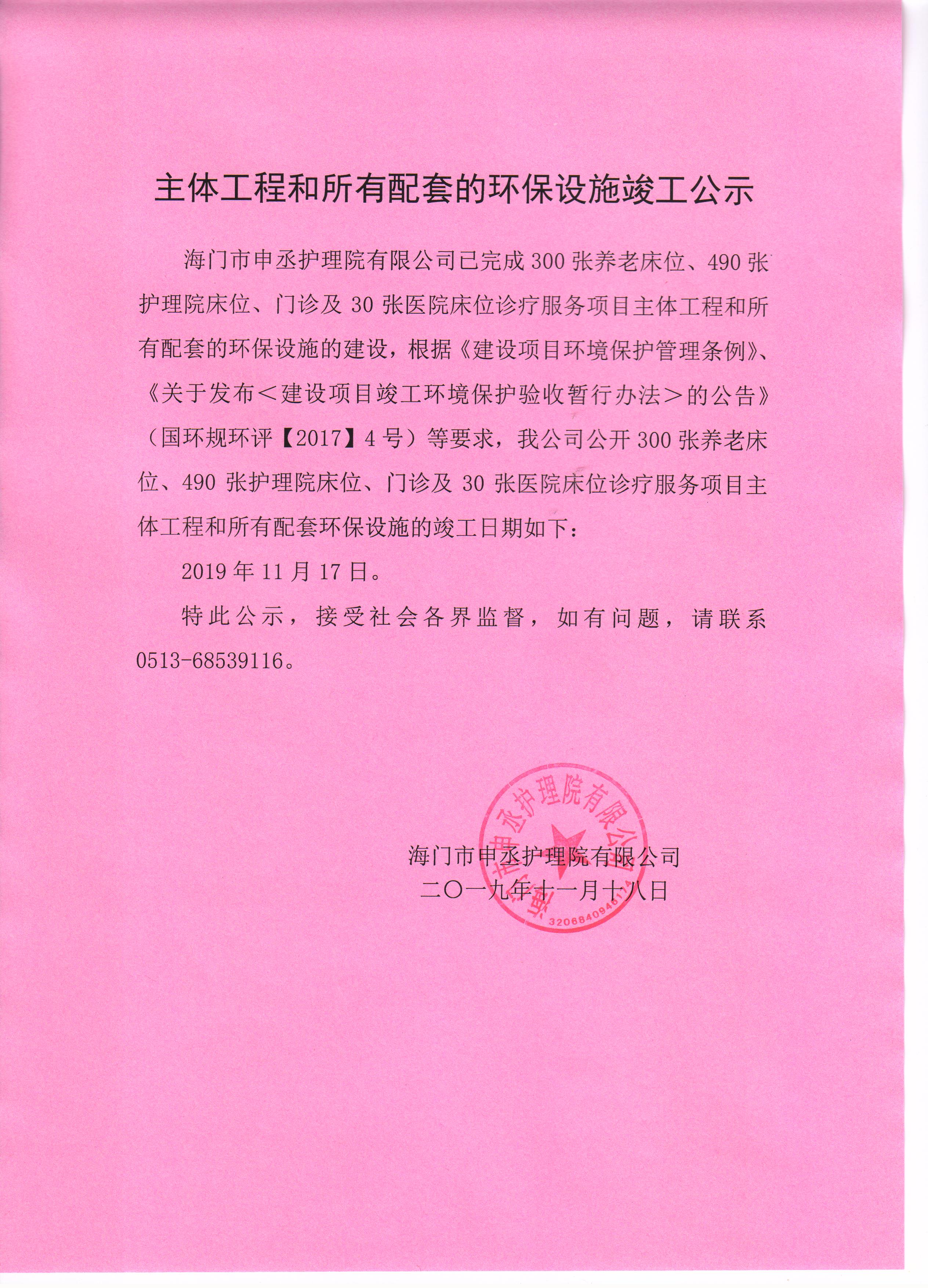 海門市申丞護理院有限公司主體工程和所有配套的環(huán)保設(shè)施竣工公示