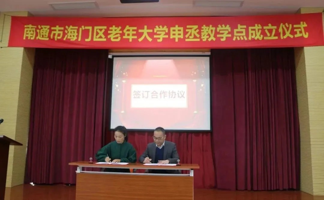海門區(qū)老年大學(xué)和海門申丞護理院簽署《海門區(qū)老年大學(xué)申丞教學(xué)點的協(xié)議書》。