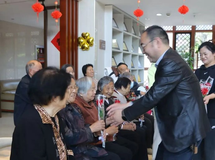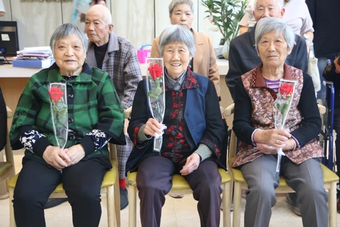 我們?yōu)槊恳晃慌蚤L者獻(xiàn)上海門申丞自制的“永生花”,當(dāng)將花朵輕輕遞到她們手中時(shí),許多奶奶開心得合不攏嘴,嘴里笑著說“好久沒收到花啦”,奶奶們捧著花,各個(gè)笑得像個(gè)少女。