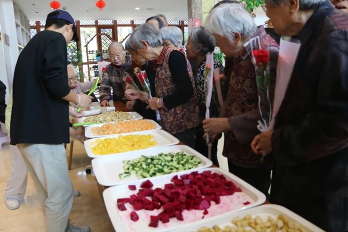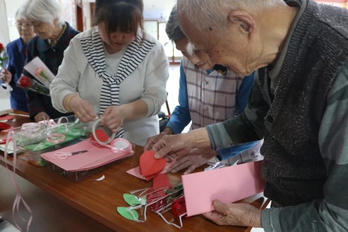 在現(xiàn)場專門設(shè)置了手工花制作攤位,在工作人員的指導(dǎo)下,爺爺奶奶們用彩紙、絲帶制作出一朵朵栩栩如生的手工花,每一片花瓣都凝聚著耐心與愛意。